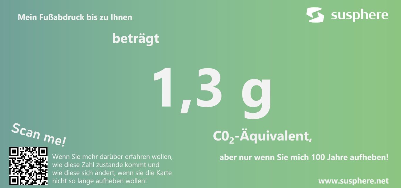 Die Karte „1,3 g“ ist ein Referenzprojekt, um die Funktionsweise und Sensitivität von Carbon-Footprint Berechnungen (CFP) zu demonstrieren.