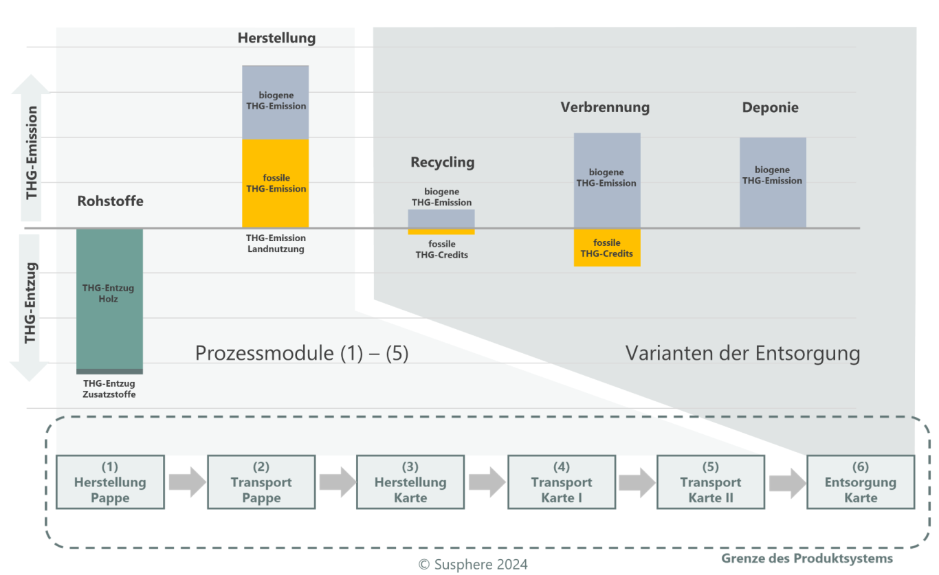 Bei einer Carbon Footprint (CFP) Betrachtung muss – anders als beim partiellen Carbon Footprint (pCFP) – immer der gesamte Lebensweg abgebildet sein. Für die Bilanzierung wird daher der vollständige Lebensweg in einem sogenannten Produktsystem dargestellt. Im Fall der Karte besteht dieser aus 6 Einzelabschnitten, die als Prozessmodule bezeichnet werden. Für jedes dieser Prozessmodule werden die relevanten In- und Outputs bestimmt, die dann zu einer vollständigen Sachbilanz zusammengefasst werden. Der Wert von 1,3 g stellt nur die Summe der ersten 5 Prozessmodule dar. Tatsächlich entstehen durch das Prozessmodul (6) „Entsorgung Karte“ noch erhebliche THG-Emissionen, die die Werte deutlich verändern.